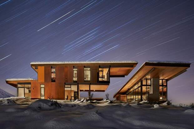 Фасадная часть дома отделана прочной кортеновской сталью, а для отделки интерьера была использована бывшая в употреблении древесина. В главном, самом большом и практически прозрачном из-за большой площади остекления здании размещается социальная зона открытой планировки – гостиная с роскошным дровяным камином, кухня, столовая и бар. Стеклянные раздвижные двери по периметру, при желании, полностью объединяют внутренний и внешний мир в одно пространство. Во втором доме находится приватная зона, состоящая из главной спальни и спальни для детей. Третий объект занимает гостевой номер, а в четвертом, самом маленьком строении оборудована сауна.